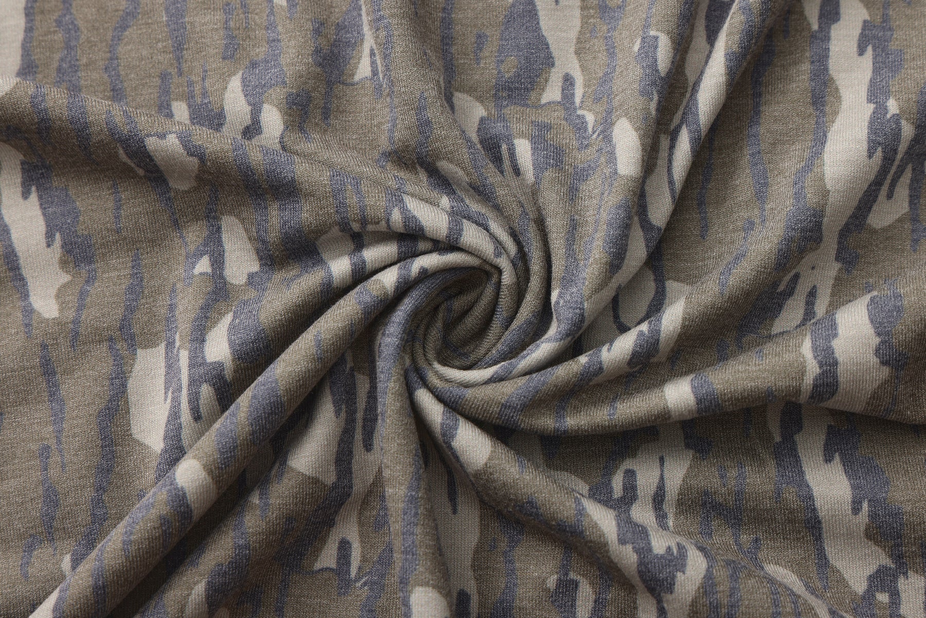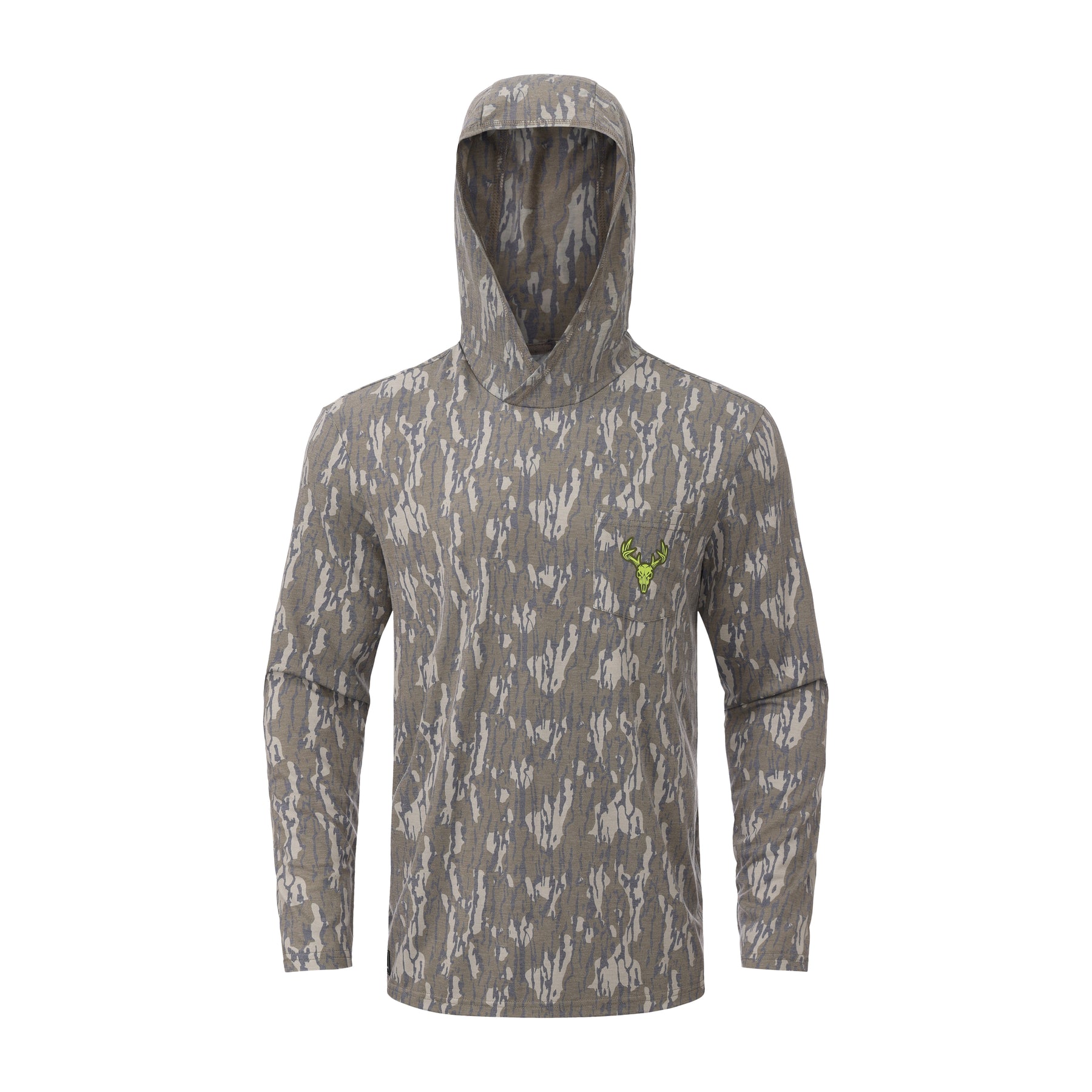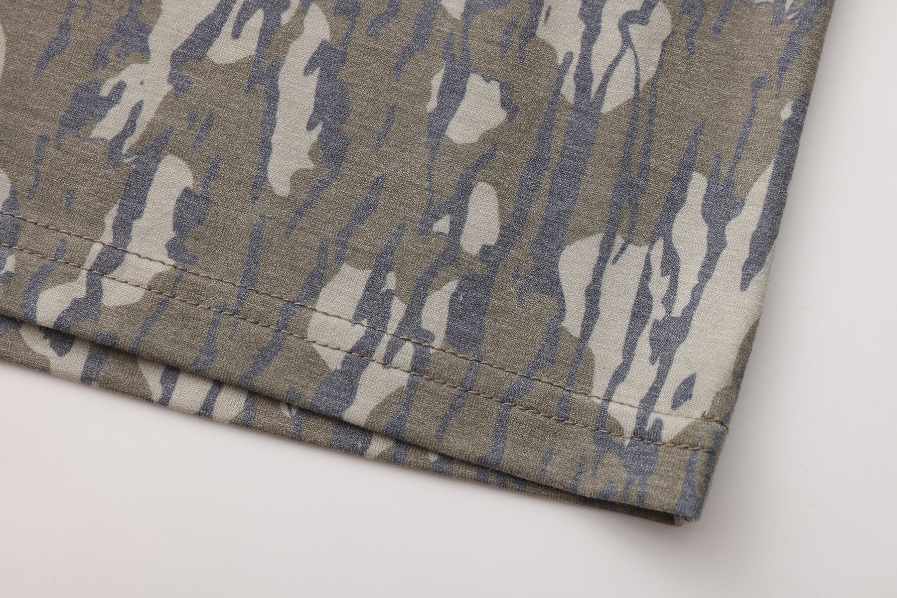 Key features • Flooded Timber vertical-bark camo pattern for timber and river-bottom hunts • Lightweight, soft 65% polyester / 35% rayon fabric • Quiet hand that won’t swish and scratch when you shift in the stand • Hi-vis yellow 8-point buck skull logo on chest, shared with the ADK Big Timber line • Athletic cut that layers cleanly over a base and under a shell • Woven hem label and One More Hunt branding details